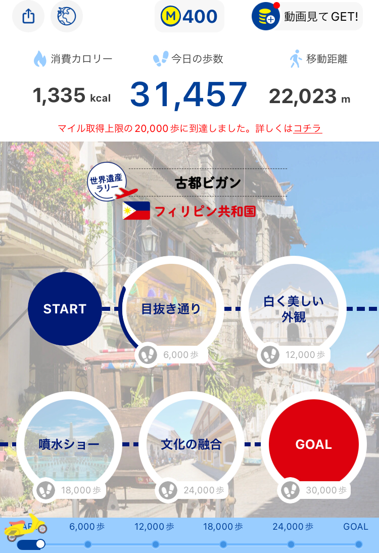 マイルの一日の取得上限は20000歩分となっています。これ以上はラリーは動きませんし、もちろんマイルは貯まりません。歩いて損ということはありませんが、マイル取得上限は覚えておきましょう。